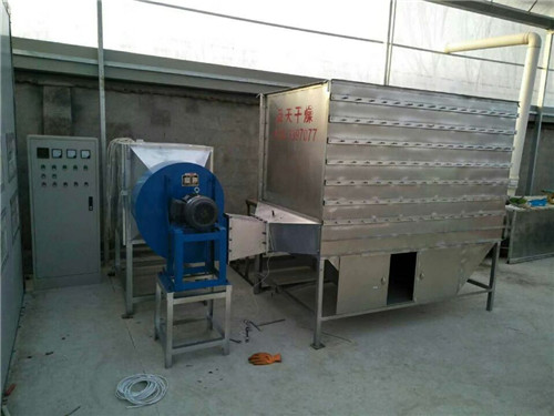 熱源可用電、燃?xì)狻:娓蓹C(jī)為七層,烘干箱外側(cè)的每一層都有一個(gè)手動(dòng)搖柄,先把最頂層放上鮮料,攤平;這層物料水分最大,熱風(fēng)與鮮、濕物品接觸,產(chǎn)生大量水蒸汽直接排空,待一定的時(shí)間看上去水蒸汽不多后,搖動(dòng)第一層烘箱手柄,搖到第二層,再把第一層補(bǔ)上鮮料,再隔一段時(shí)間繼續(xù)把第一層和第二層搖動(dòng)手柄把鮮料放到下一層,就這樣依次倫推,循環(huán)翻轉(zhuǎn),逐層烘干。